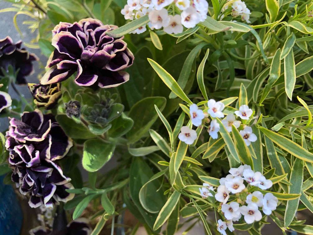 黒真珠と斑入りアリッサム素敵な💕斑入りなんでも好きです。ハイビスカスも斑入りに、でも緑の葉っぱになってます😅😱春には斑入りになるかしら?
