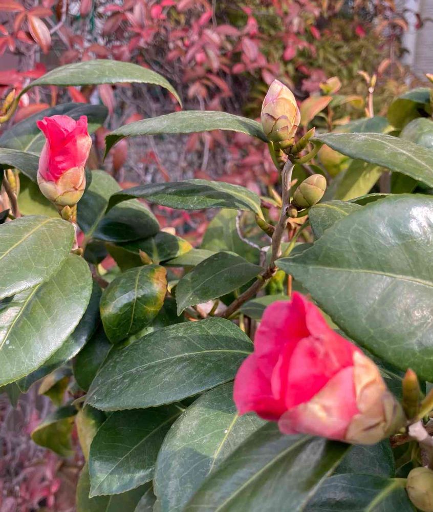 赤い椿の蕾が咲いていました。どんな花姿を見せてくれるのかしら 楽しみですね。