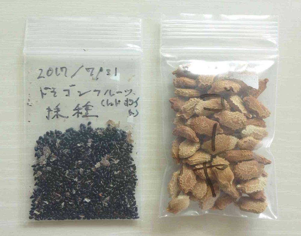 今年採った、ドラゴンフルーツ(ホワイトピタヤ)とゴーヤの種(あばしゴーヤ)。