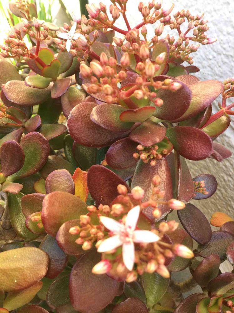 親株には花芽が付いてますが、親株から折れた物をさした金の成る木が有るのですが、それは毎回色付いて綺麗に紅葉してます。