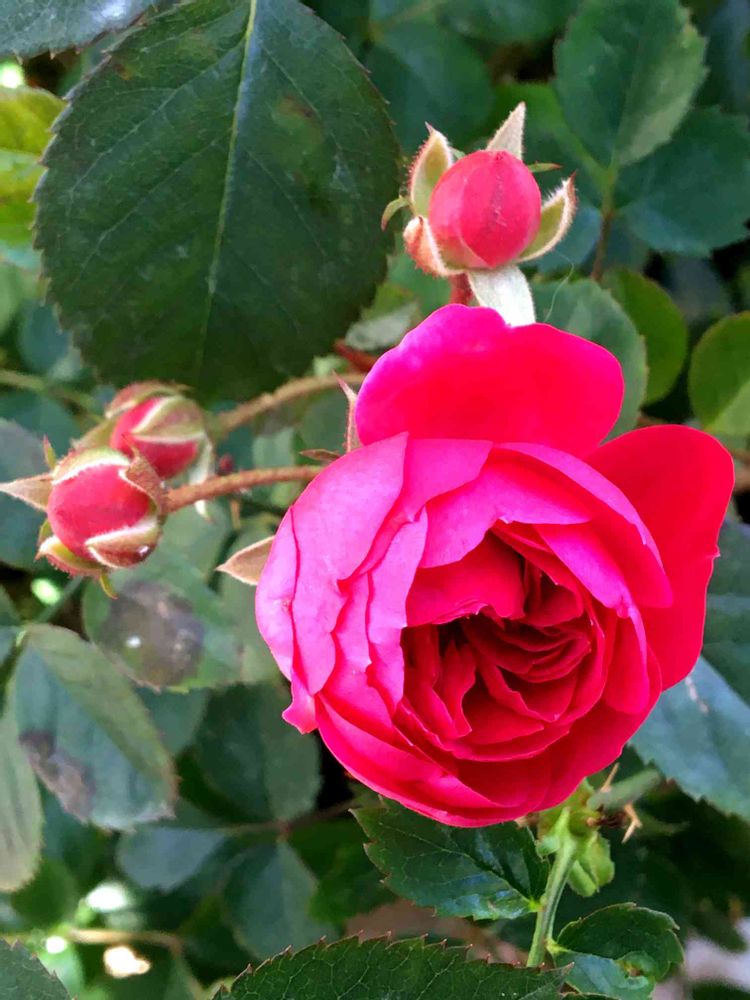 あまりにも下の方の細い枝でフェンスの脇だったのでカットして同じく黒星病になっているラブリーモアさんの葉の上で🤳
