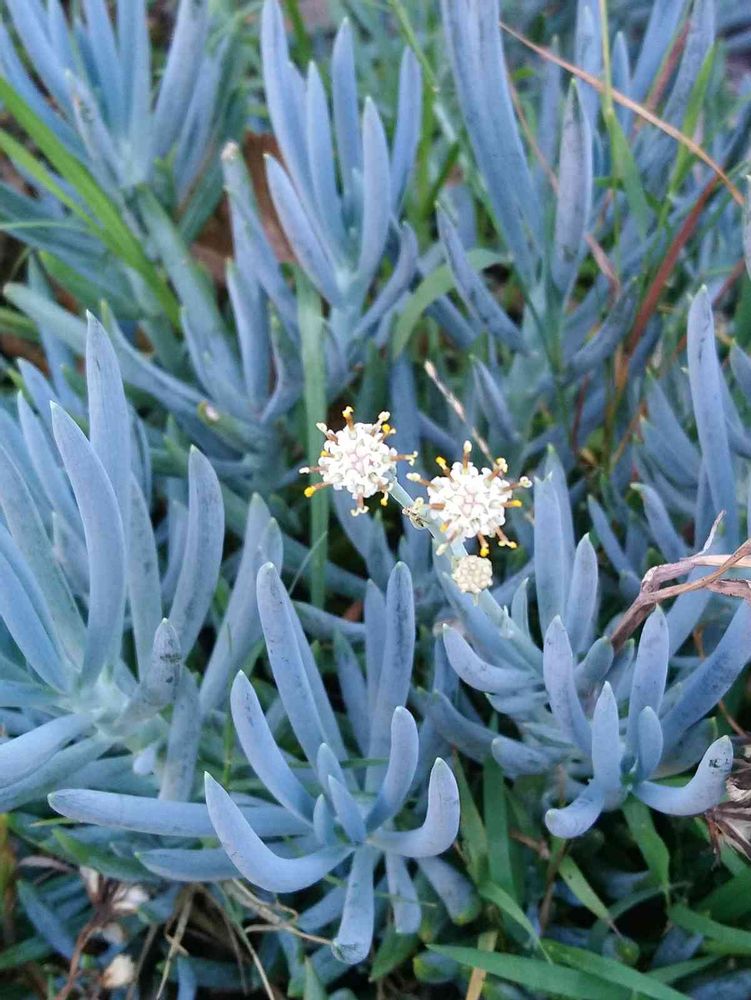 時々白い花をヒョロ〜ンと咲かせます。青白いセネシオに白いホタルが飛んでいるみたい🤗。