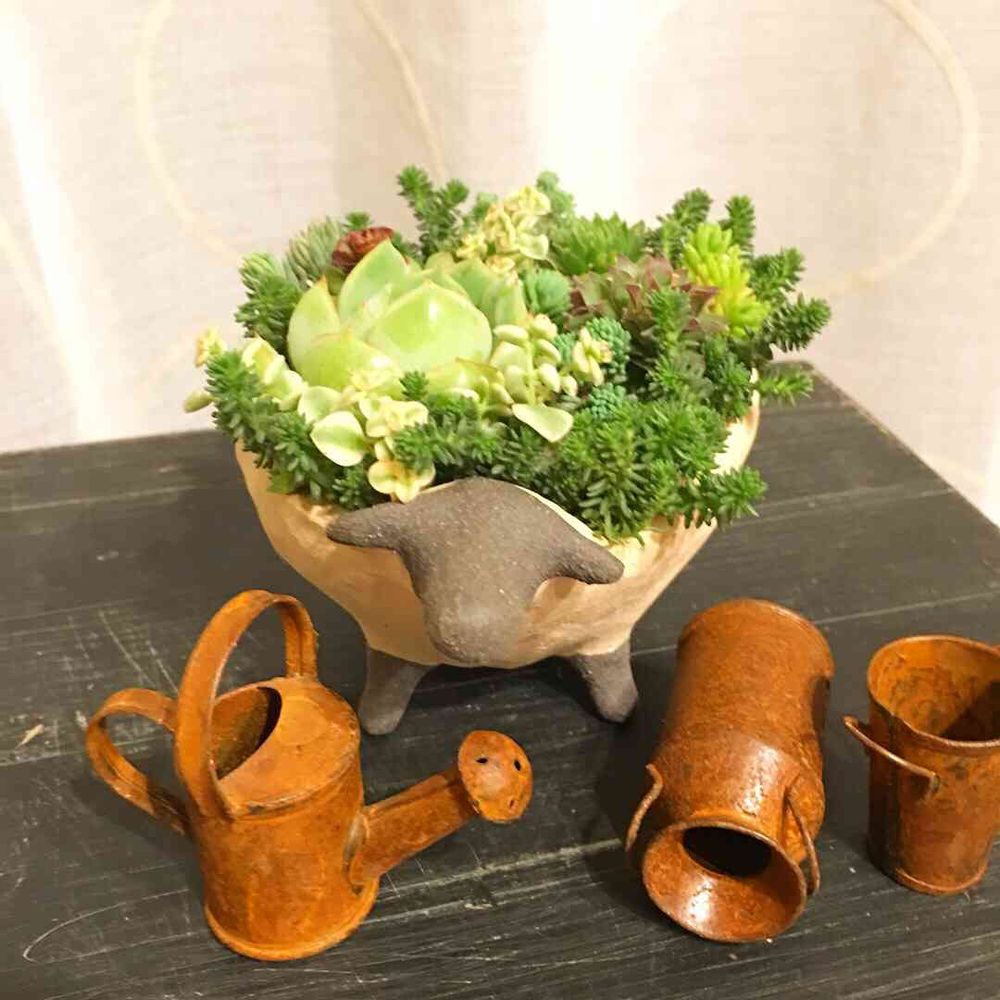 refrappe_kannaさんが制作したもりひつじ陶器植木鉢に私が寄せ植えした多肉の森🌱