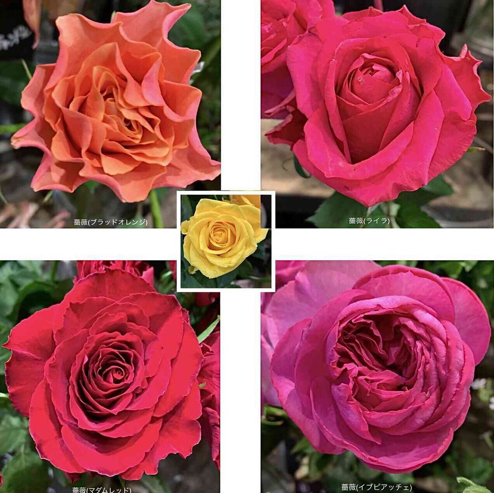 橙色・薄褐色系、ピンク系x2、赤色系のバラ、4つ。