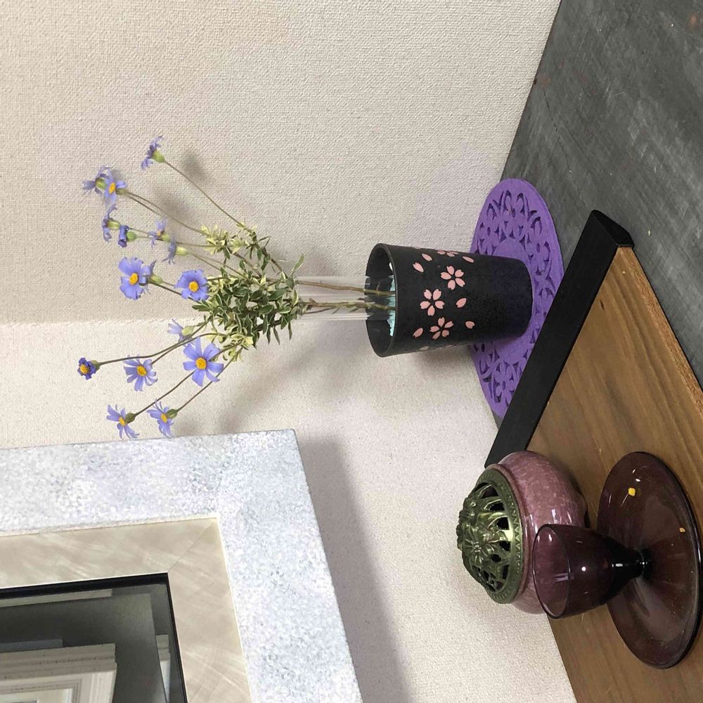 壁掛け仏壇「鏡壇ミラリエ」に今日(12/25)の誕生花の「ブルーデージー(瑠璃雛菊)」を飾ってみました。