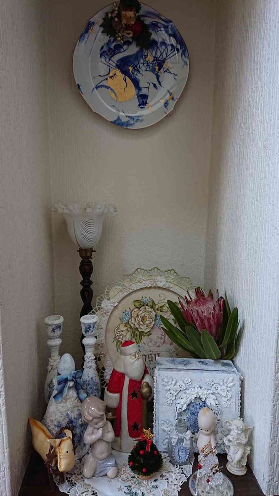 お祈りのリヤドロだけは本物ですが(お皿とランプもやった、、、)後のブルーなのやプレートは手作りなんですよ(トールペイントです)