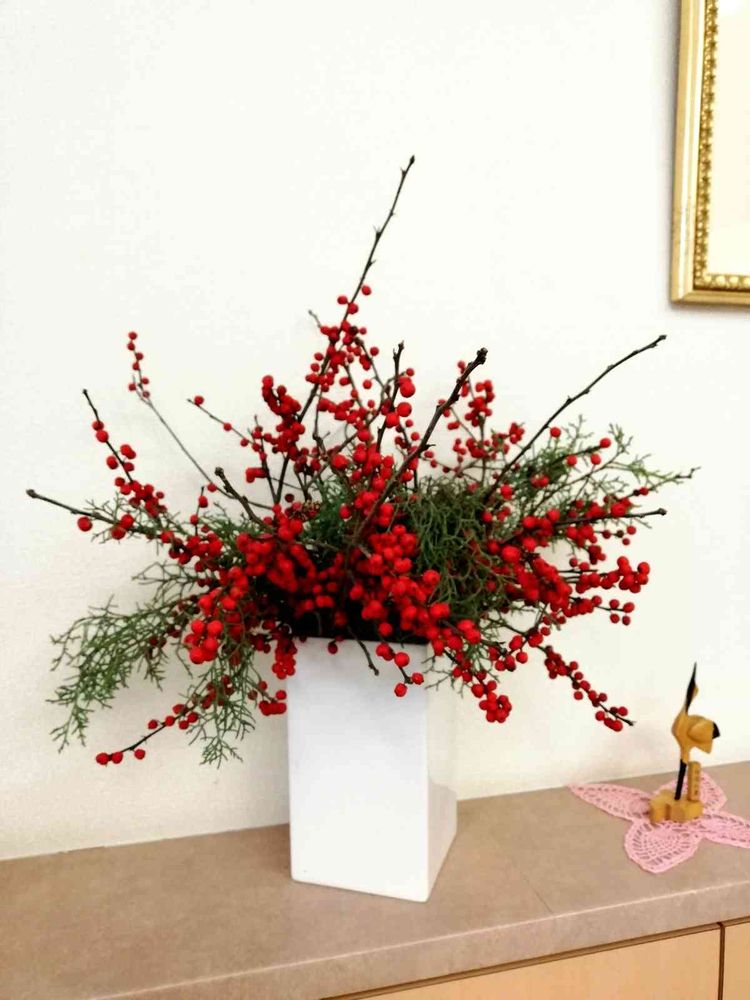 緑と赤で クリスマス気分にも…、 うめもどきと松で お正月を迎える気分にも…。