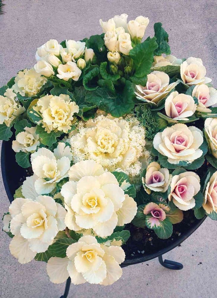 先日アップした黄色葉牡丹寄せ植えにプリムラファンタジーホワイトを足してさらにモリモリにしてみました☺️