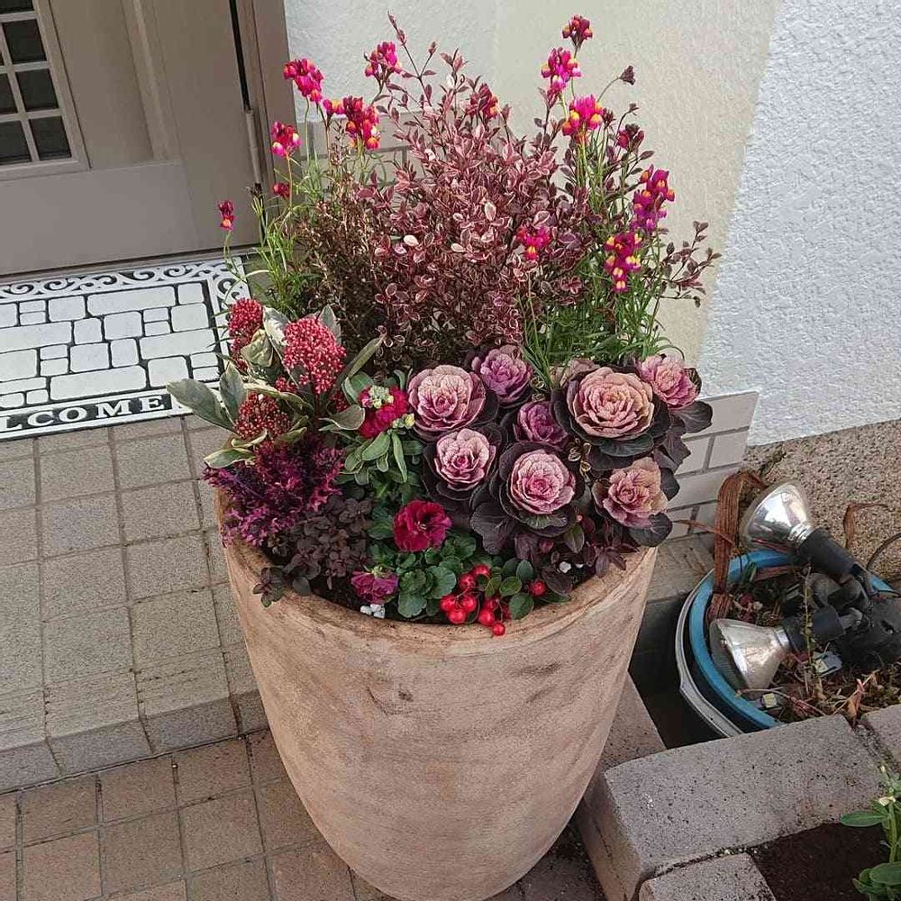 玄関前の大きなウェルカムポットには、メインに地元兵庫県加西市の葉牡丹を使って豪華に寄せ植えさせて頂きました。