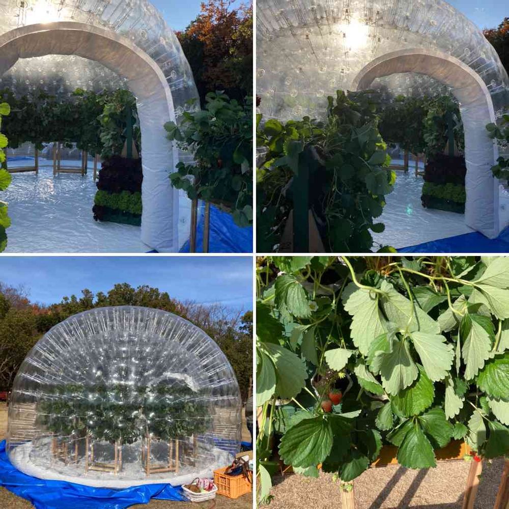 大きなビニールドームに、苺ポットが苗ナナメに入る壁面棚にセットして開催してました。