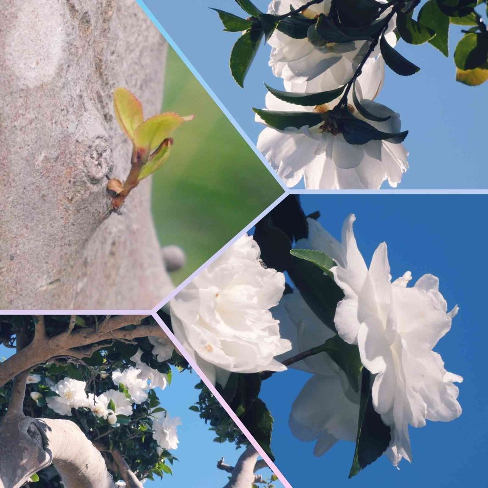 白い山茶花🌼と青空、素敵な風景やね🤗小さな新芽も可愛らしやね🤗