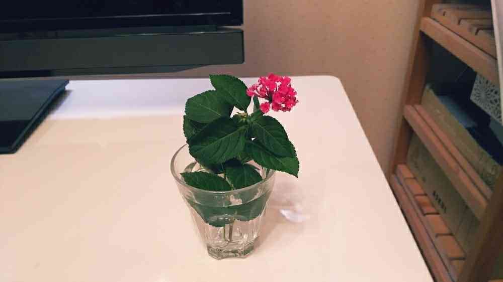 ランタナの枝が折れてしまったので、コップに挿してみました🥀犯人は恐らくうちの🐕です😖私がベラパトすると、すごい勢いでランタナの匂い嗅いでいます😥