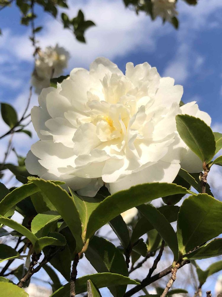 空と白い八重咲きの山茶花、気持ちいいですね。深呼吸してしまいました😃🤍