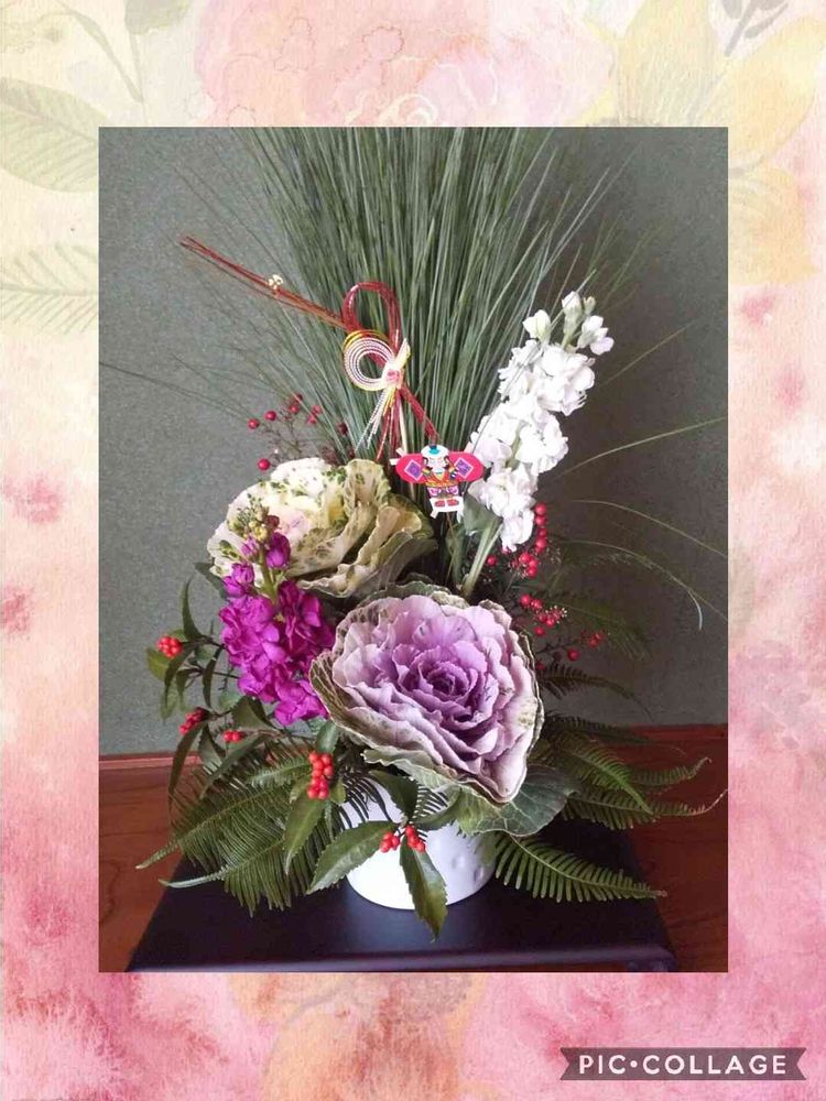 うわー‼️華やかで素敵です✨もう準備着々ですね~‼️ストック?が長い松と合ってますね🎵葉牡丹も良い感じだし。とってもバランスが良いアレンジですね~❤️