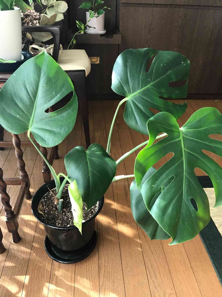 数年前に一鉢 買って 去年5鉢のモンステラになりました。お嫁に出した鉢もあるのですが 置いてる場所によっては葉っぱの色がくすんでます。肥料なのか 日当たりなのかはよくわかりません💦