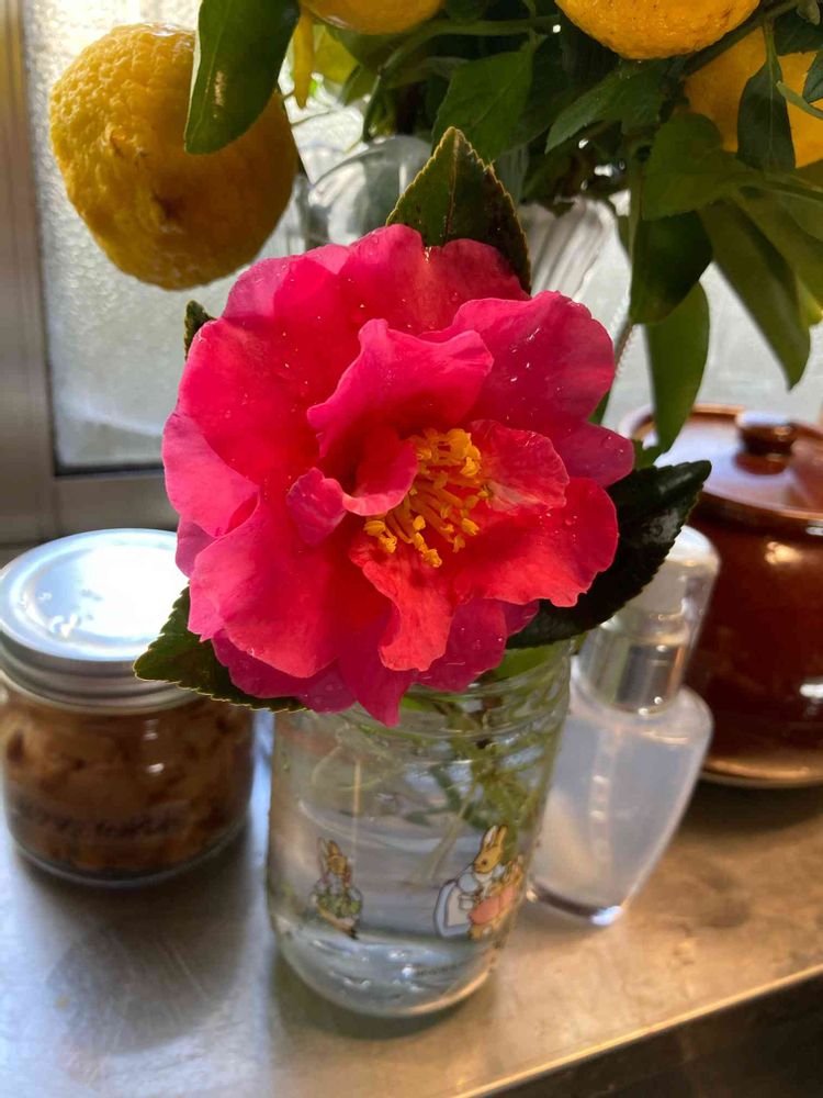 庭の山茶花を台所の出窓に活けました🥰しあわせです🥰台所のゴチャゴチャした物はスルーしてくださいね😆