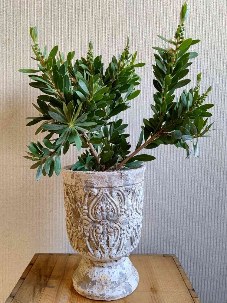根鉢がガチガチだったカリステモン(ブラシノ木)白を鉢上げ。この鉢は別に使いたいので取り敢えずの植え替えで。