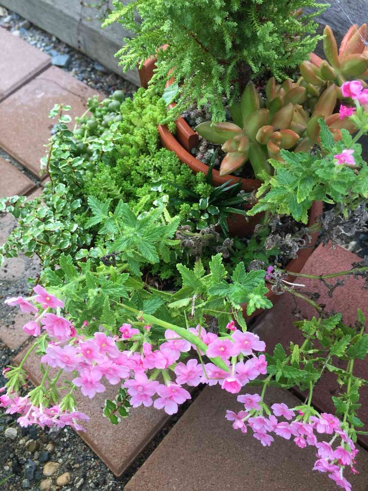帰宅して、小庭の花たちをチェックしていたら…水が足りないのか、赤みがかってしまった秋麗と…花の位置が微妙なバーベナ。