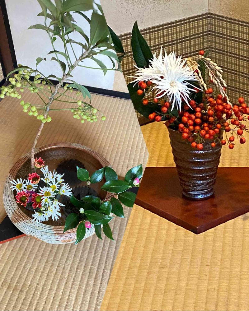 左側の白い万両はお庭に植わってる様な生け方ですね。足元が大事🌺お花が開花するの楽しみですね💖
