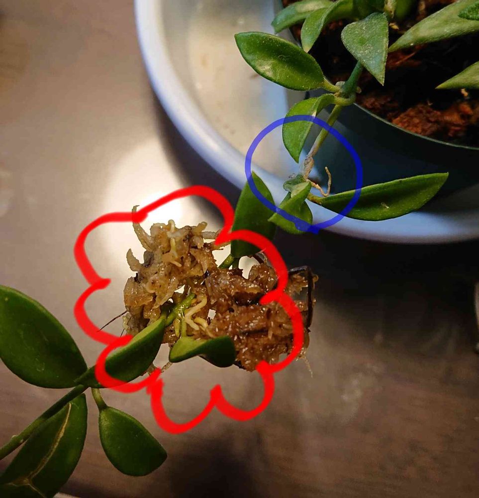 青○の部分が折れてしまい、その先の気根が沢山あるところを水苔で巻き、ラップ!1ヶ月程でしっかり根になりました🥰見えないけれど新芽も出てきたのでちょっきんしますっ✂️