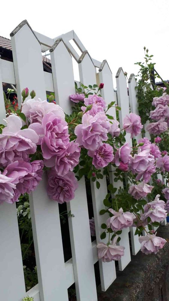 真っ白な板塀にステキレイニーブルーが映えますね〜🌹ステキ〜✨