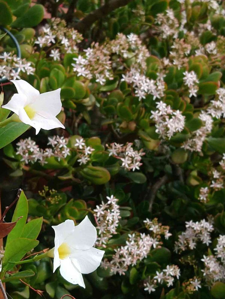 マンデビラが小さめですが未だ咲いています。金のなるきをバックに📸。