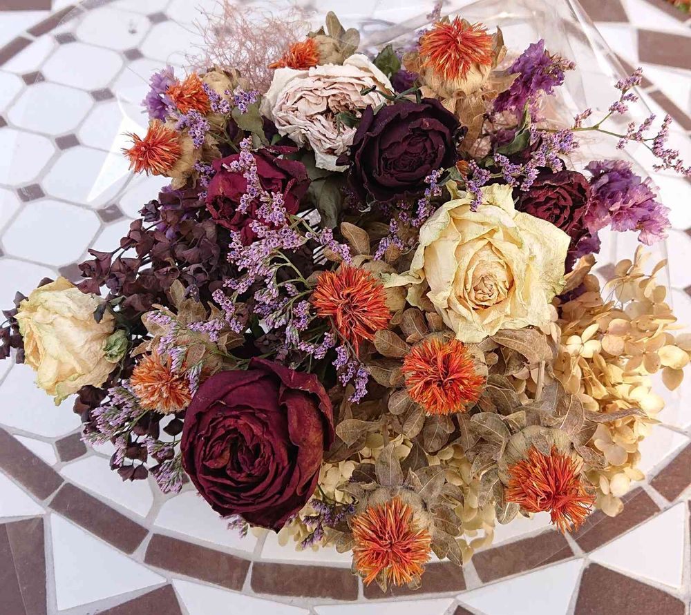 今年は明日からデイサービスお休み。ドライにしておいた花を集めて花束に🎵 これならお世話しなくてもいいもんね🎵
