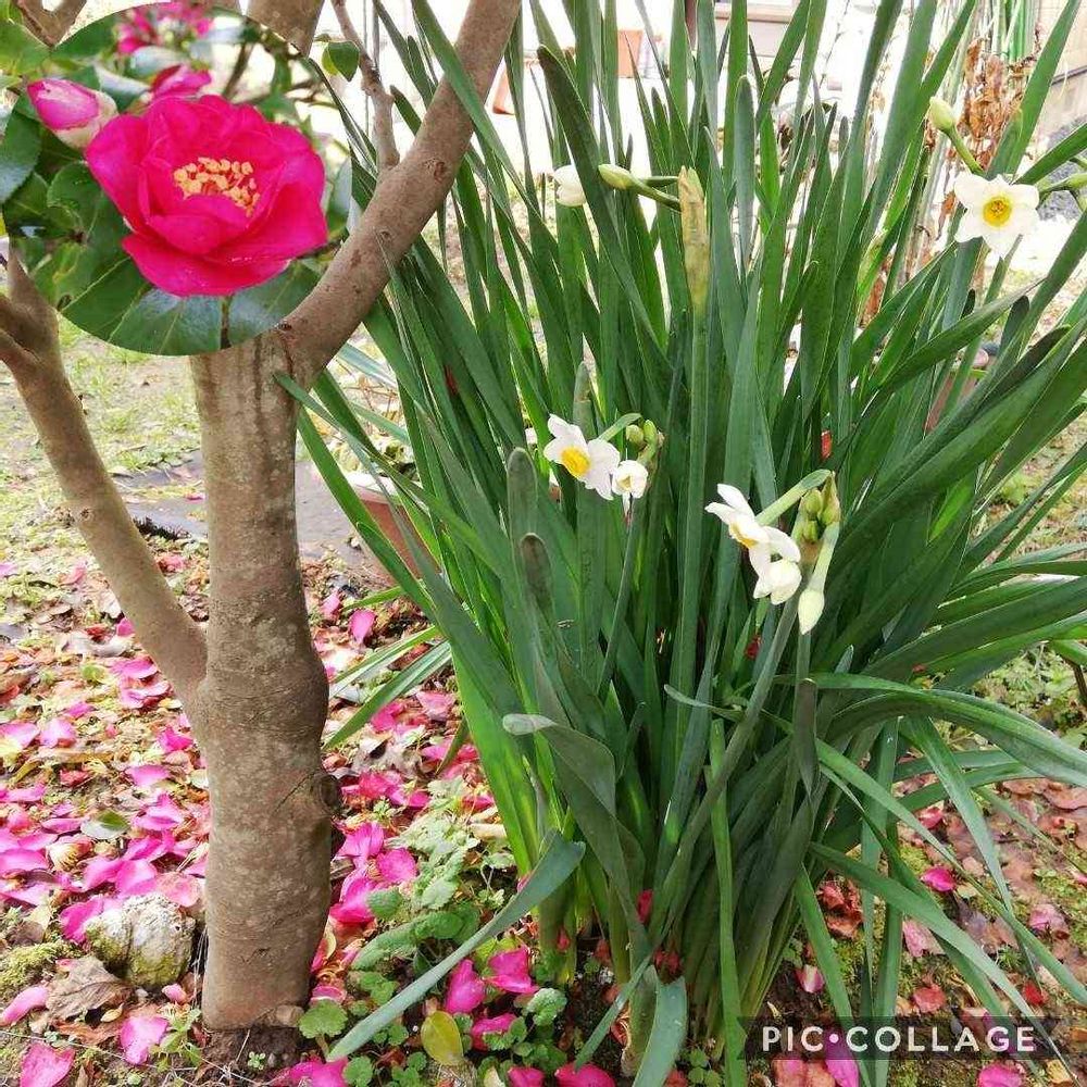大きな(背丈程の)木は山茶花だけで、この木のまわりには黄色い水仙や芍薬、桔梗があって… ちょっと🌱⚠️気をつける場所だったり🥰 次の黄色い水仙の芽も出始めてて 👣おっとぉ〜でした😅春に咲くほうの水仙もスタンバイ👌