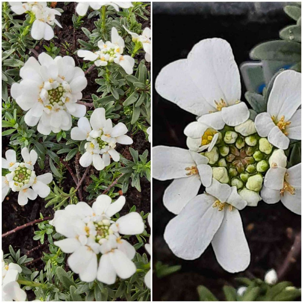 イベリス➰白い小さな花が丸く集まって咲いていますが、ひとつひとつは4枚の花弁で…外側2枚が大きく内側2枚が小さい…うさぎさんのような可愛いお花🐰