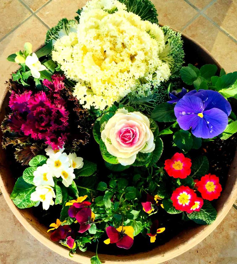 葉牡丹とブルーのパンジーとピンクのプリムラ、元気が出る寄せ植えですね。
