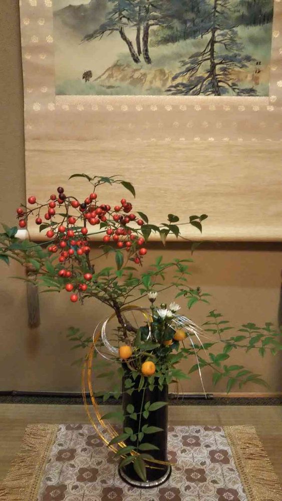 南天と金柑と白い小菊、金銀の水引でお正月っぽく。百合も葉牡丹も千両もないけど、まあいいや😆