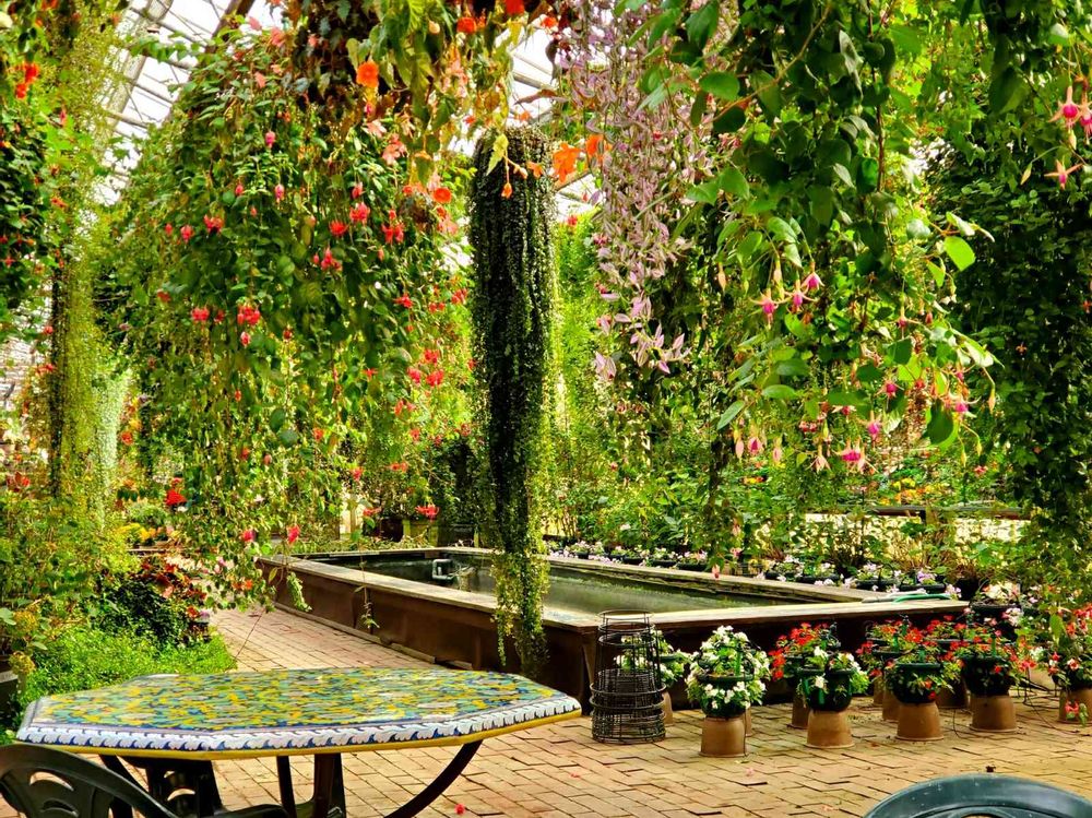 天井から垂れ下がる グリーンネックレスに驚きました。花と鳥に囲まれた幸せな時間でした。