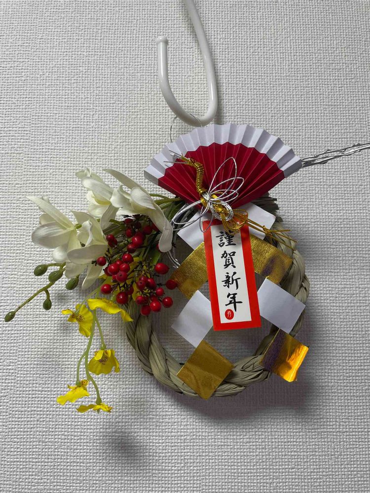 百均のお飾りに百均の造花蘭2本と本物のナンテンをプラスして出来上がり。