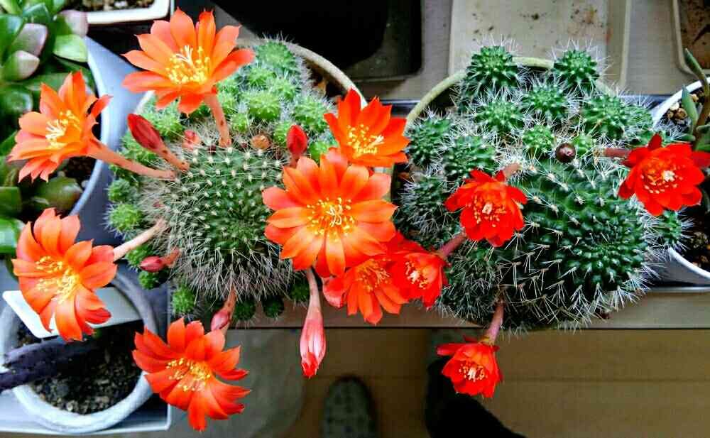 お気に入りの二人です。今は花が終わって、真ん中の大きいサボテンがやや萎んで周りの子分がニョキニョキ育ってますよ😄