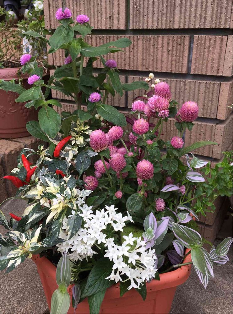 千日紅、今年は植えるタイミング外して、今頃寄せ植えにしました。