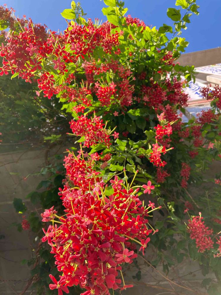 お花の赤色と葉の緑色が青空に映えていて、とてもきれいです👍✨