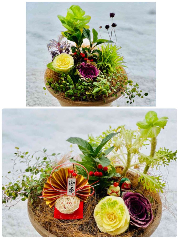 🖼小さくなった葉牡丹に追加の葉牡丹と藪柑子、お正月飾りを入れました✨
