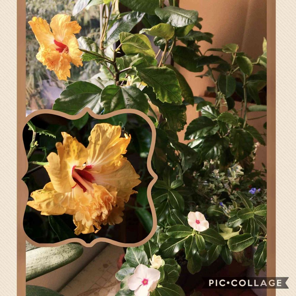 これで最後のイエローフラミンゴさん🦩とニチニチソウ、アメリカンブルーの寄せ植えと、花は咲いてないけどマンデビラ、マダガスカルジャスミンなど、夏の花コーナーです🤗