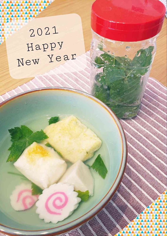 年末の寒波で枯れる前に、庭の三つ葉を摘んで串カツの容器に入れて冷蔵庫保管しておいたので、今年も自前の三つ葉入りのお雑煮です。