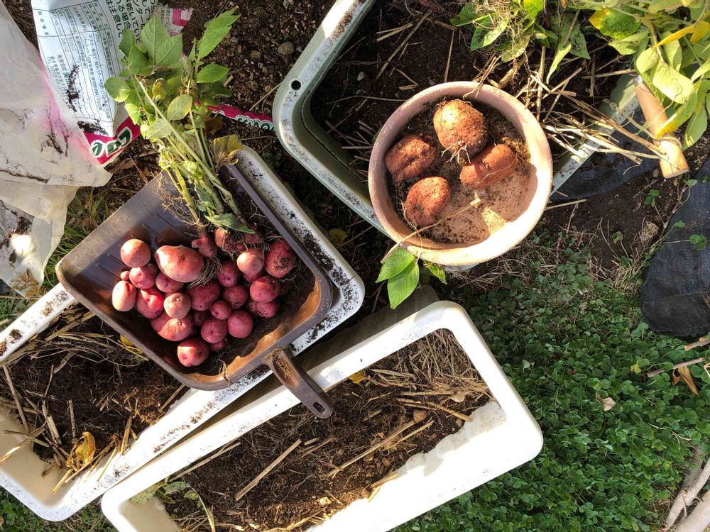 令和3年 1月1日(金)晴れ☀️ ( ´ ▽ ` )ノ やっちまいました〜😆🎍🌅⛩アンデスレッドの収穫です❣️ 天気が良くってー🙄暇で〜😬地上部枯れてるし......この前の分美味しかったから😝親イモ(種イモ)6個分です 全部が親イモより小さなサイズ😅😙未だ残ってま〜す。