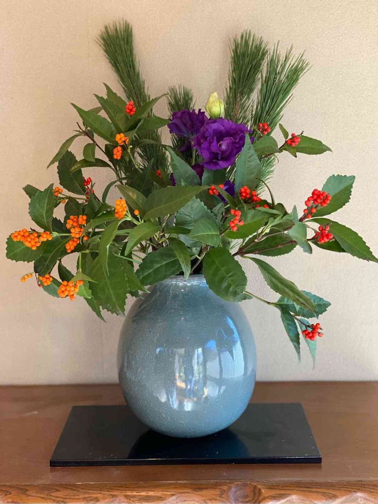 千両の実の色に紫のトルコキキョウが合っていて、ステキ(*˘ᵕ˘*)**。