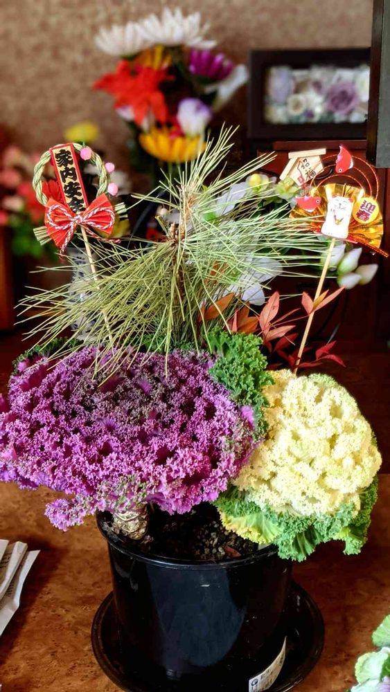 1昨年なくなったおばあちゃんのところに飾ったお花お正月用のでっかい葉牡丹です。