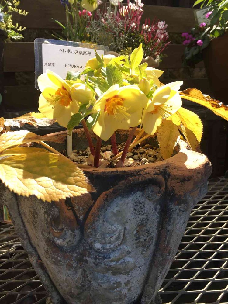 このクリスマスローズは会員の展示株で「ゴールド」と呼ばれている交配種です。名前の由来はネクタリー(雄しべの周りのもの)の色です(確か)。また、葉っぱもイチョウの黄葉のように黄色くなります。