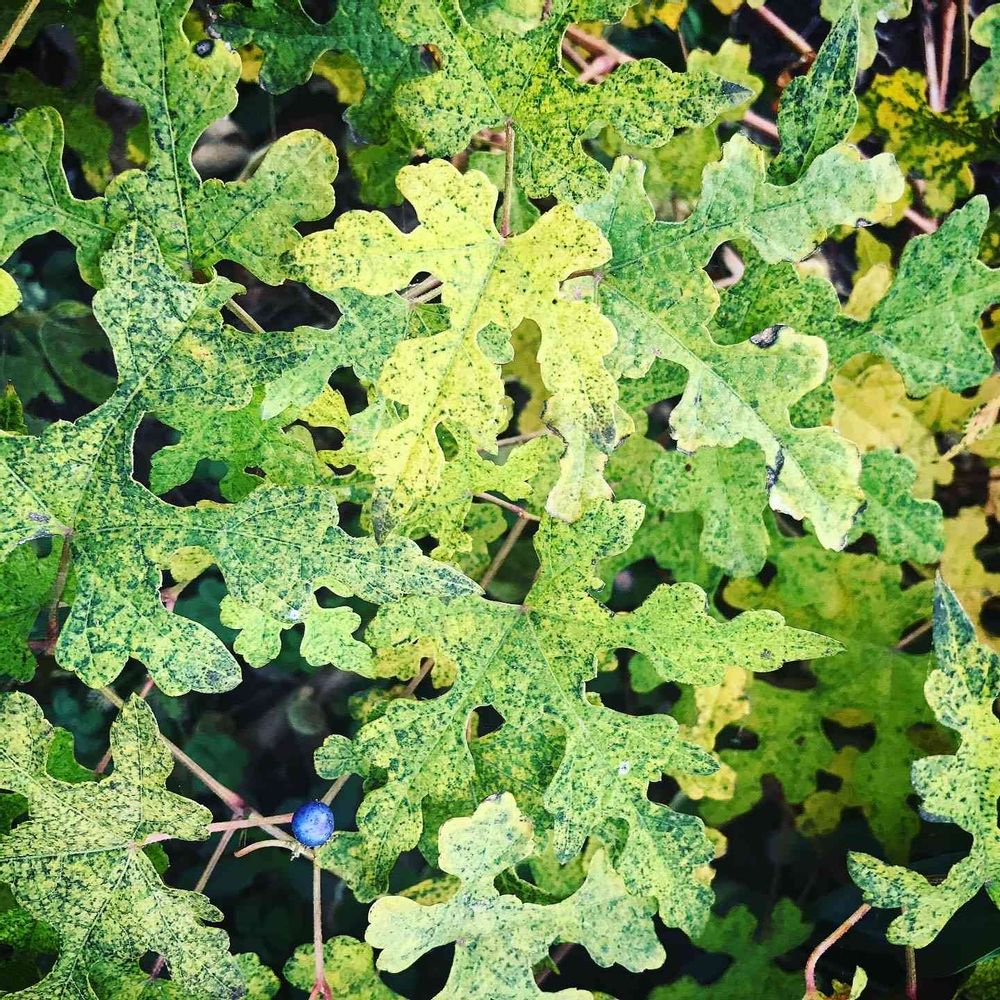 普通の野ブドウも青い実が素敵ですが、斑入り葉だと 一層コントラストがいいですね。😃