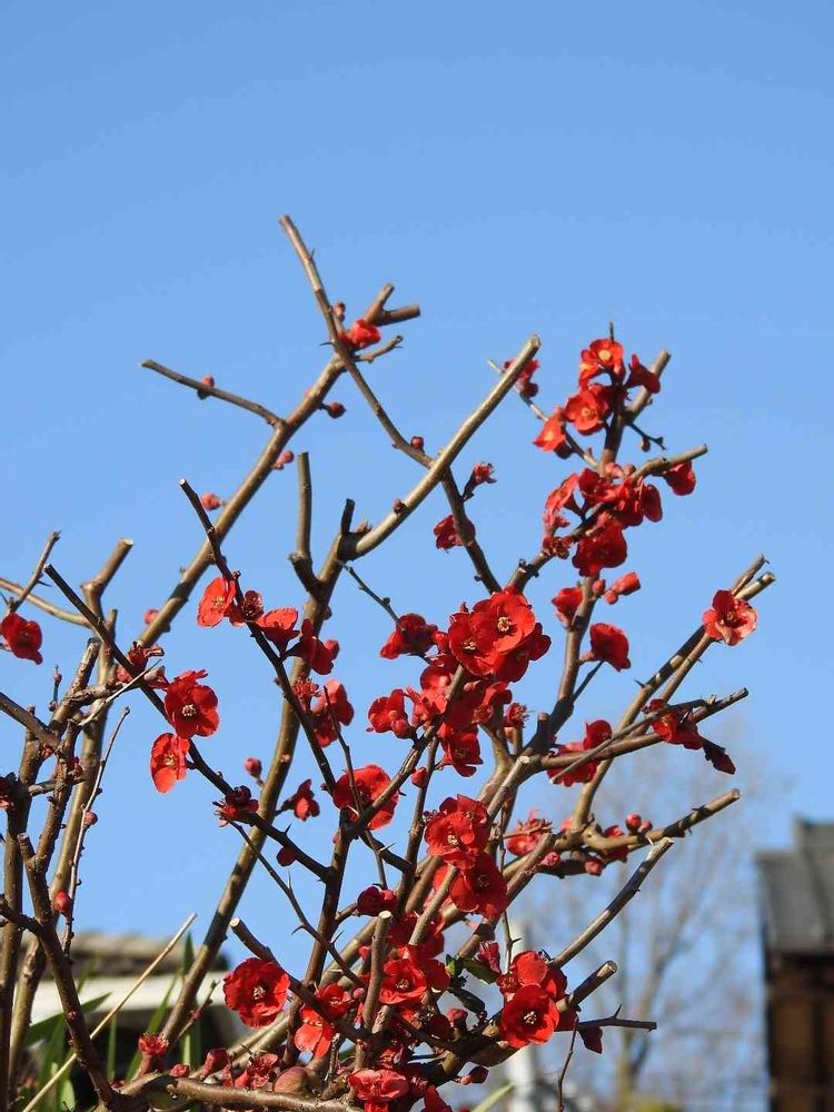 道すがら見た❗民家の庭先で青空とコラボする綺麗な🏵ボケの花🏵
