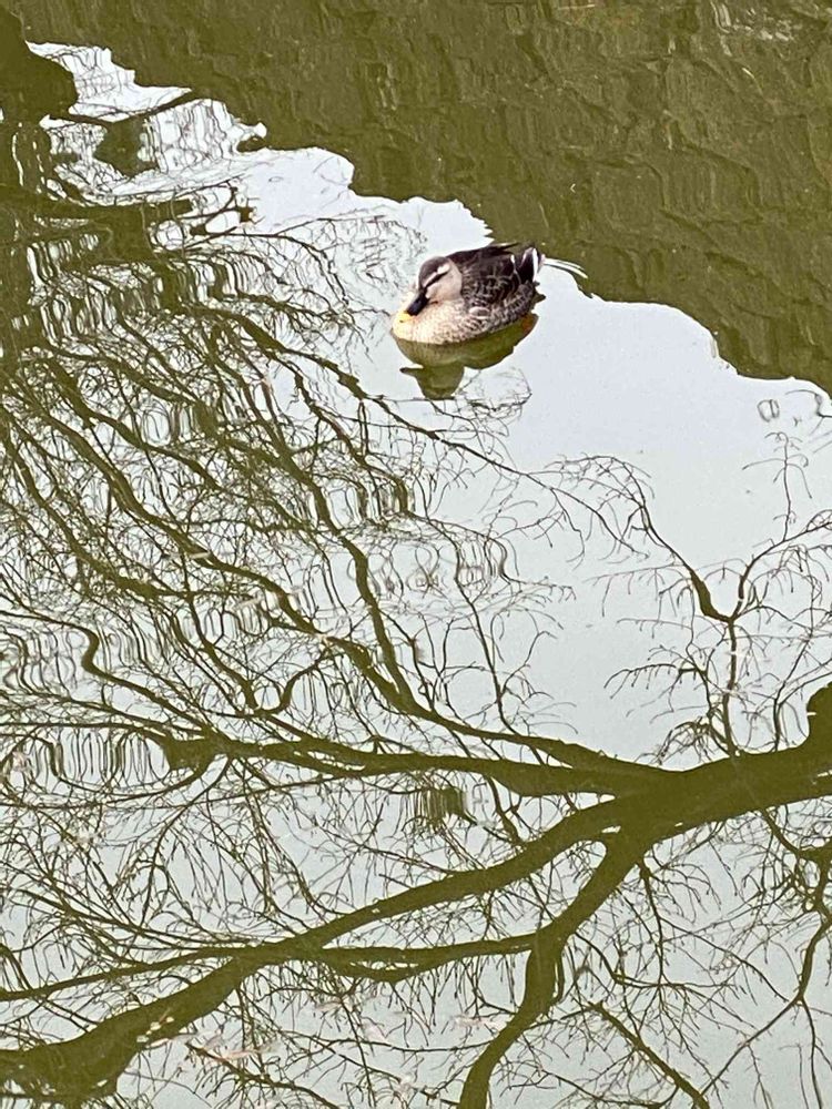 水面に映った石垣と木の間を自由に泳ぎ回るカモ。