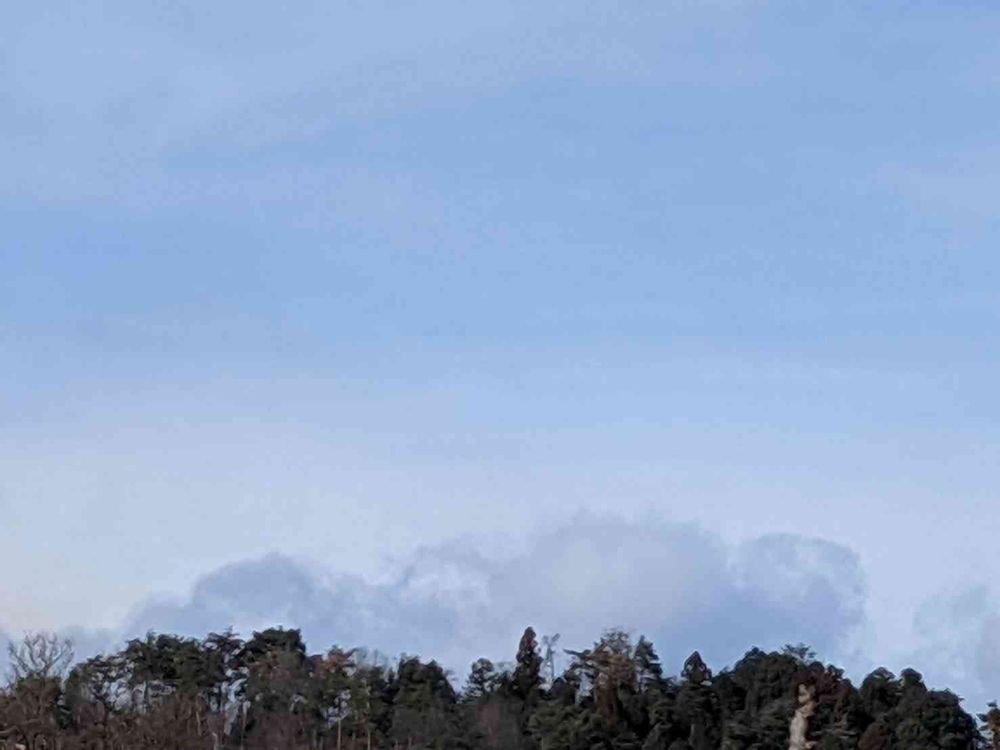 庭より。先程の遠景の右の方。高台の雑木林の上にのどかな雲。他の方の素晴らしい画像に啓発されて、こちらもアップすることにしました。その美しさ、とっても及びませんが…。☁☁☁