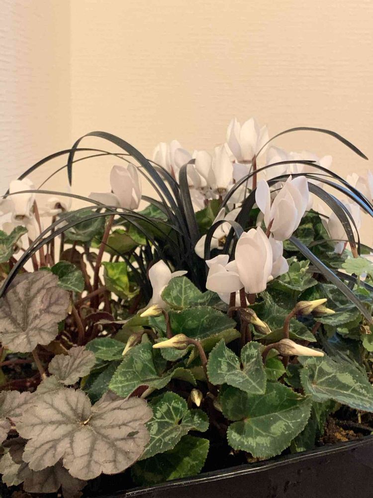 ガーデンシクラメンと黒竜のモノトーン寄せ植え(*´︶`*)♡
