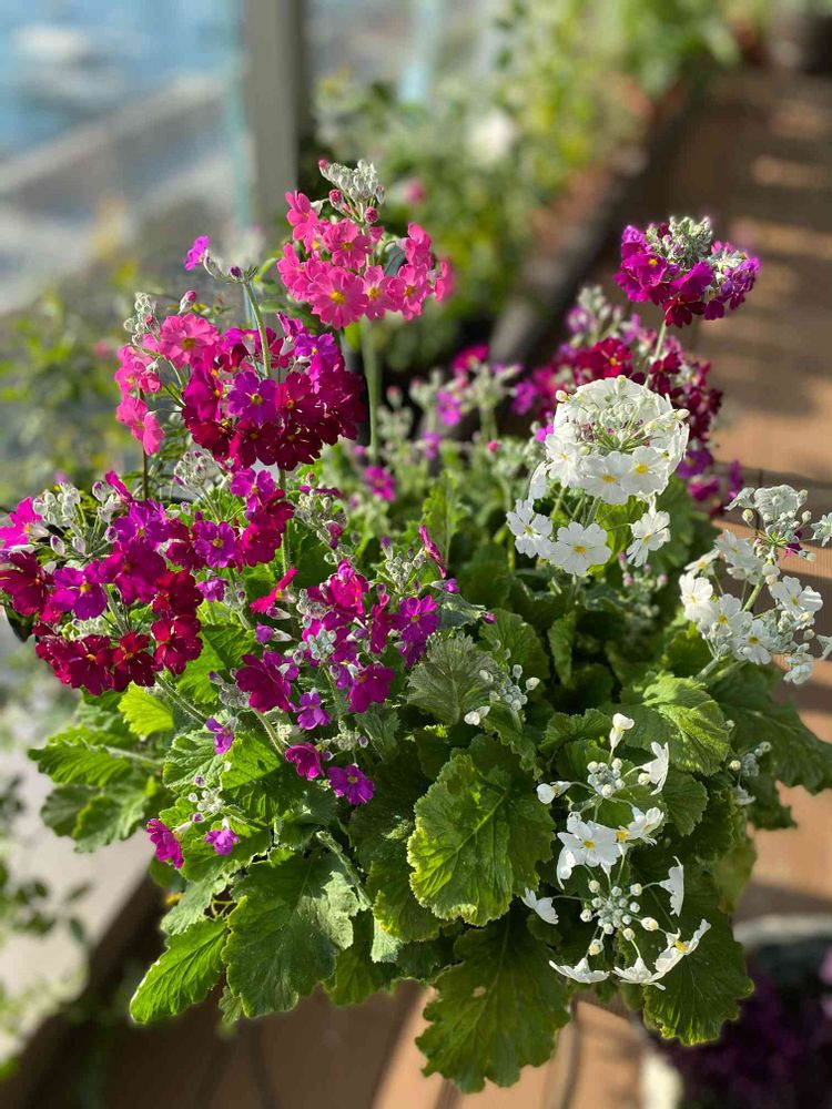 赤×2、白×1、ピンク×1の寄植えにした花芽が、日に日に開いてきてます。