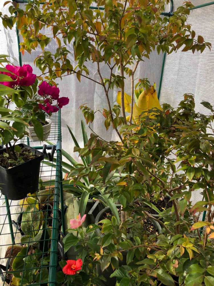 オレンジのハイビスカス🌺がさきました。小さなビニールハウスの中です。今日は少し暖かく感じる。